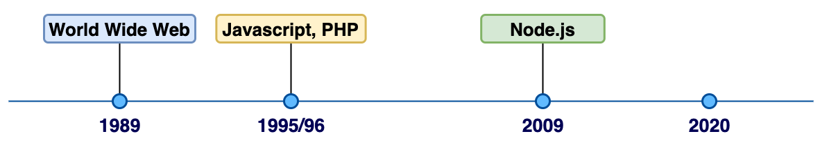 Just to give you a sense of the timeline here, the World Wide Web started around 30 years back. Javascript was born about 25 years ago and about the same goes for PHP (26 years). Node.js, on the other hand, is only 11 years old. Despite its relatively short run, Node.js has done wonders for developer organizations around the world.